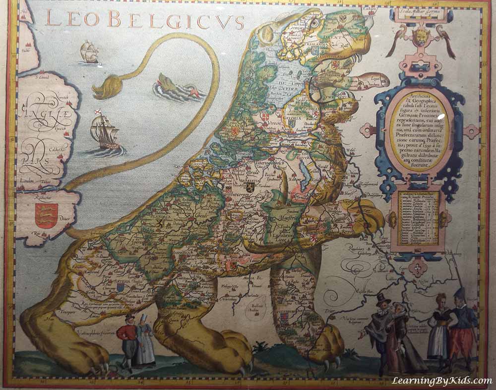 This one is a Leo Belgicus Map by Petrus Kaerius, from 1617. The European countries of Holland and Belgium form the shape of a lion because it was the symbol used in many coats-of-arms in the region. The lion was a reference to Holland’s power as a sea-faring kingdom and colonizing empire overseas. The Dutch East India Company, incidentally, was established in 1602.